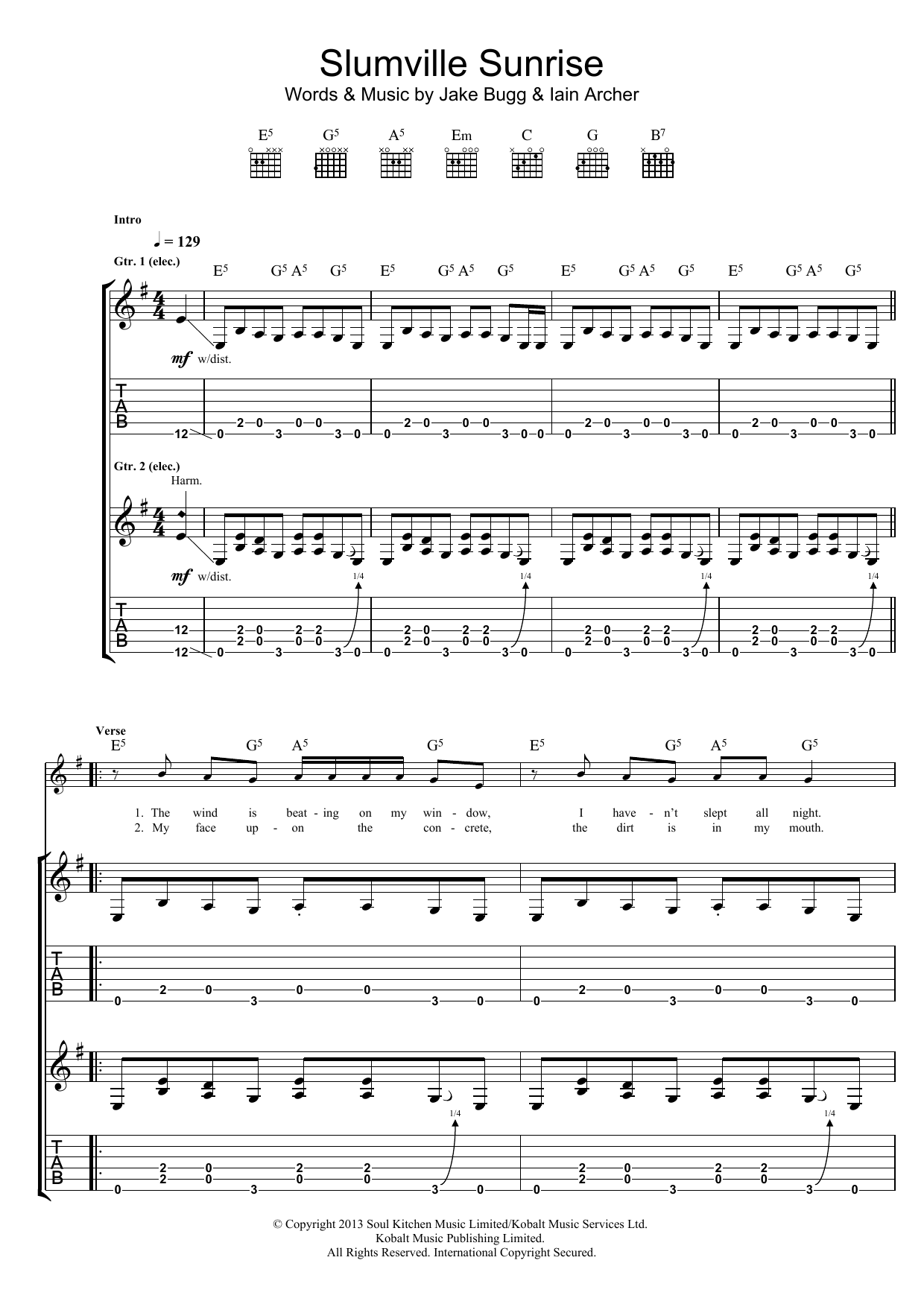 Download or print Jake Bugg Slumville Sunrise sheet music, chords and digital score arranged for Guitar Tab. This Rock score includes 8 page(s).