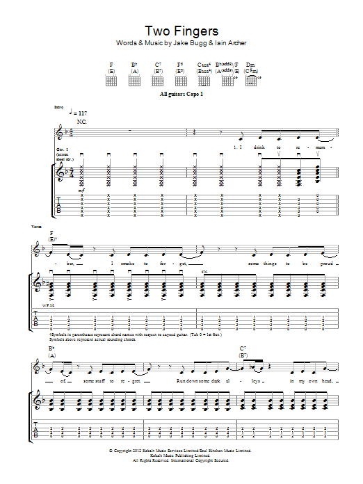 Download or print Jake Bugg Two Fingers sheet music, chords and digital score arranged for Guitar Tab. This Rock score includes 5 page(s).