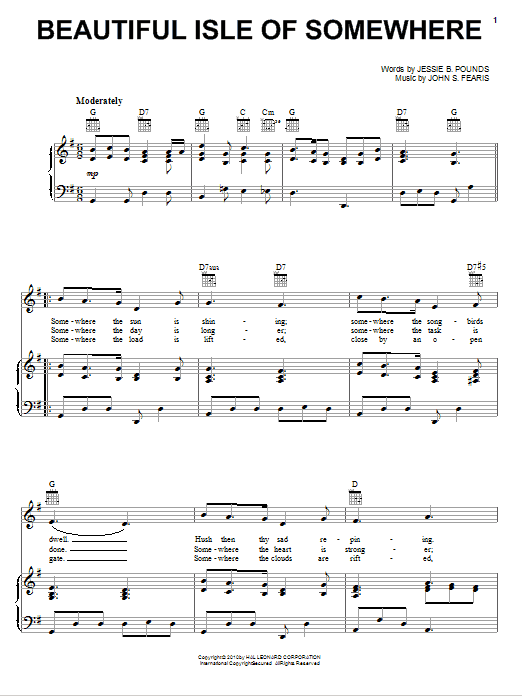 Download or print Jake Hess Beautiful Isle Of Somewhere sheet music, chords and digital score arranged for Piano, Vocal & Guitar Chords (Right-Hand Melody). This Christian score includes 2 page(s).