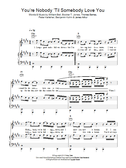 Download or print James Arthur You're Nobody 'Til Somebody Loves You sheet music, chords and digital score arranged for Piano, Vocal & Guitar Chords. This Pop score includes 4 page(s).