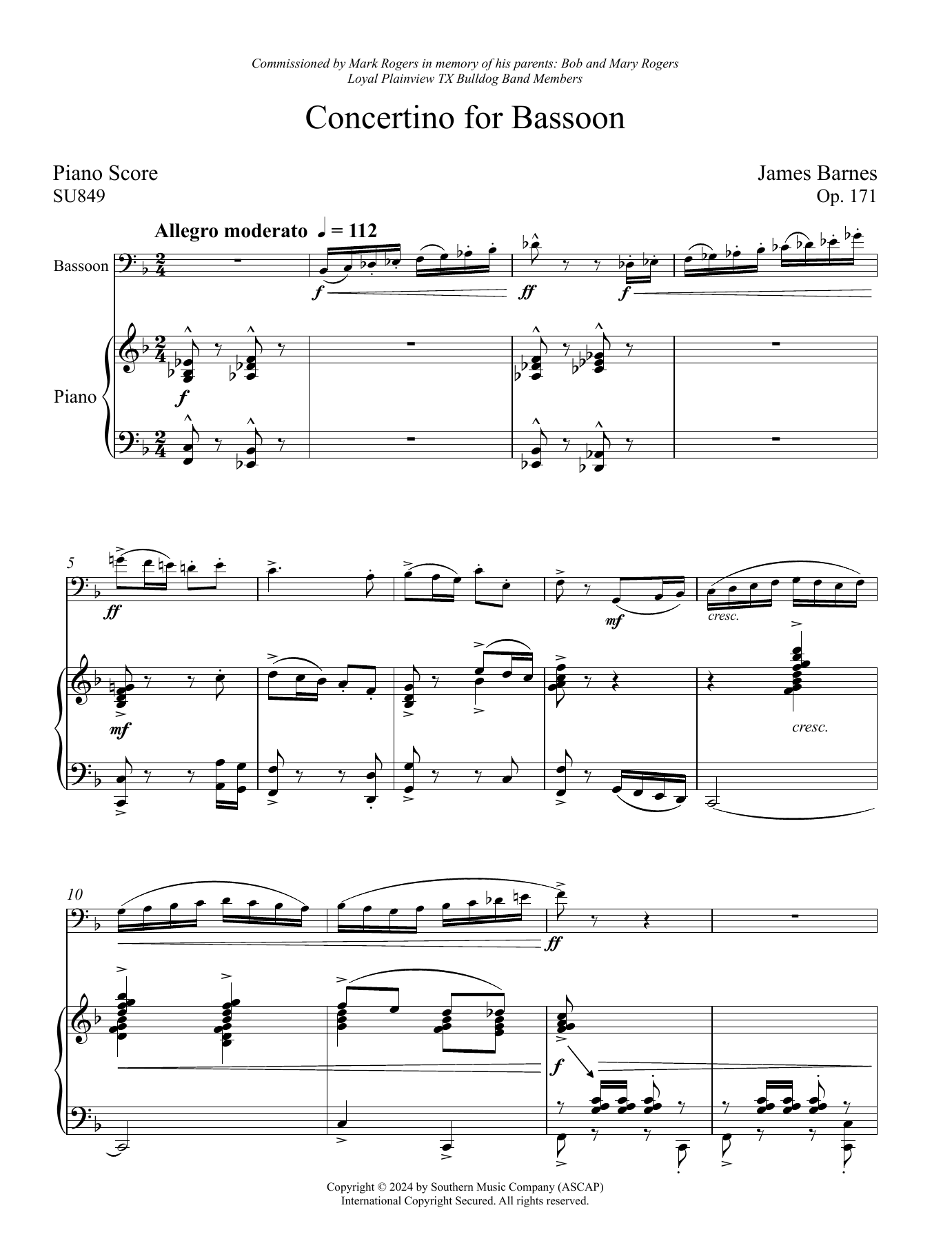 Download or print James Barnes Concertino for Bassoon (Solo / Piano Reduction) sheet music, chords and digital score arranged for Woodwind Solo. This Concert score includes 28 page(s).