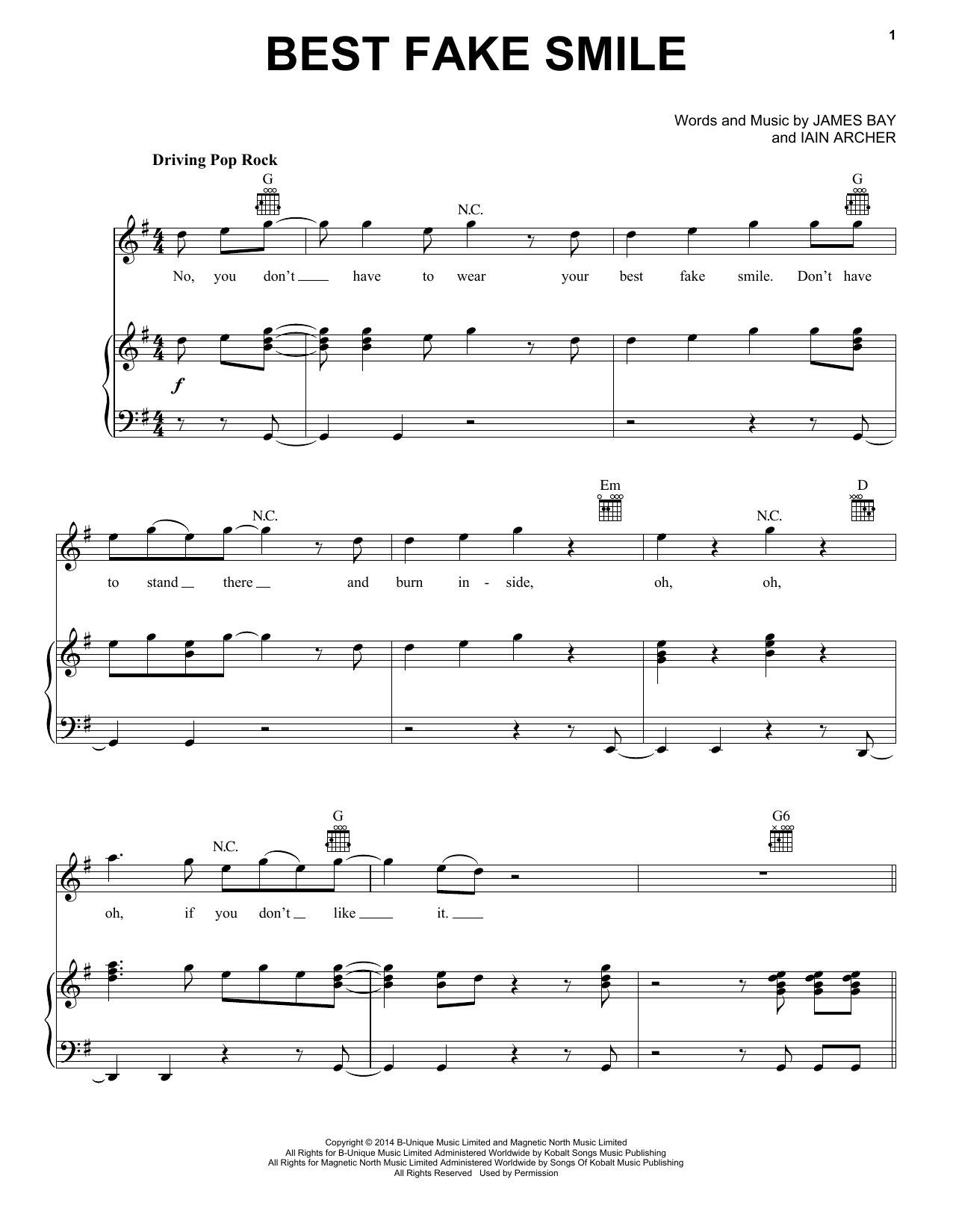 Download or print James Bay Best Fake Smile sheet music, chords and digital score arranged for Piano, Vocal & Guitar Chords (Right-Hand Melody). This Pop score includes 8 page(s).