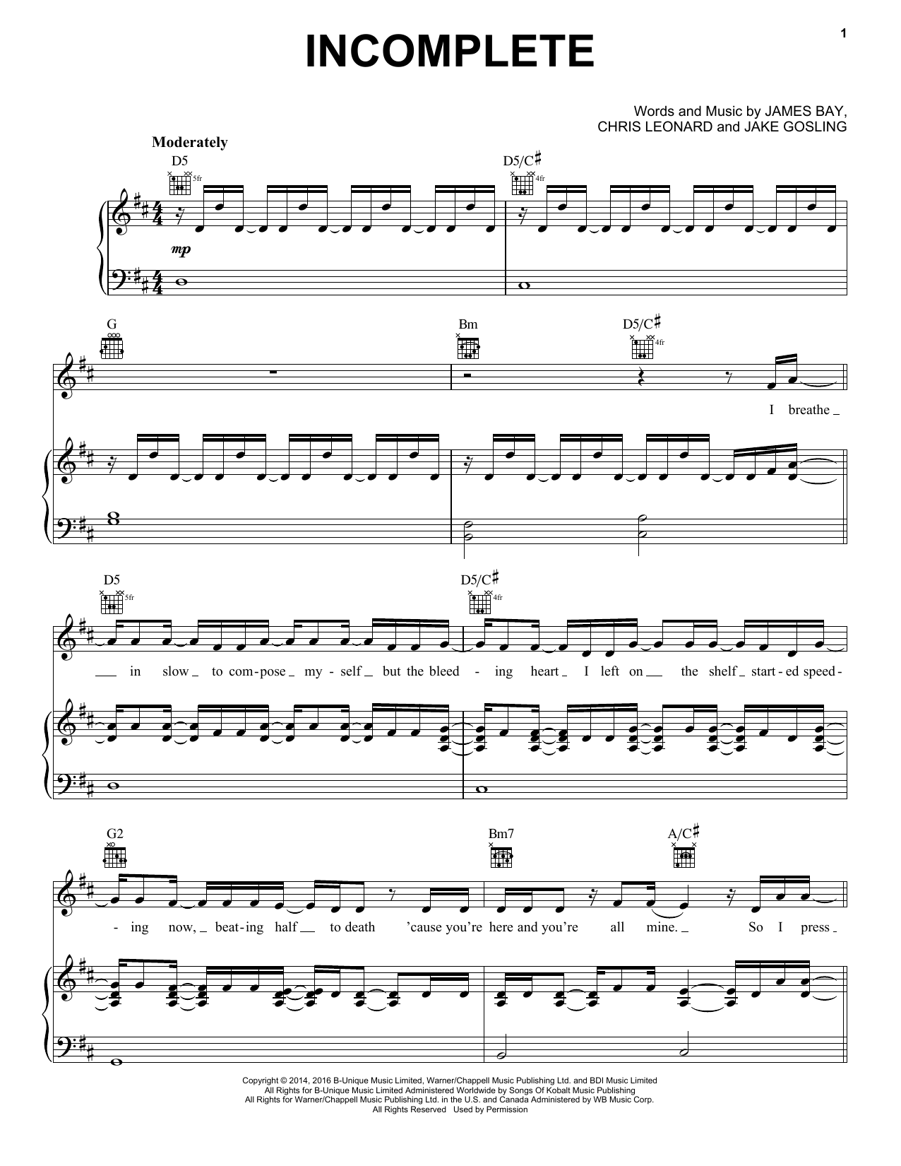 Download or print James Bay Incomplete sheet music, chords and digital score arranged for Piano, Vocal & Guitar Chords (Right-Hand Melody). This Pop score includes 6 page(s).