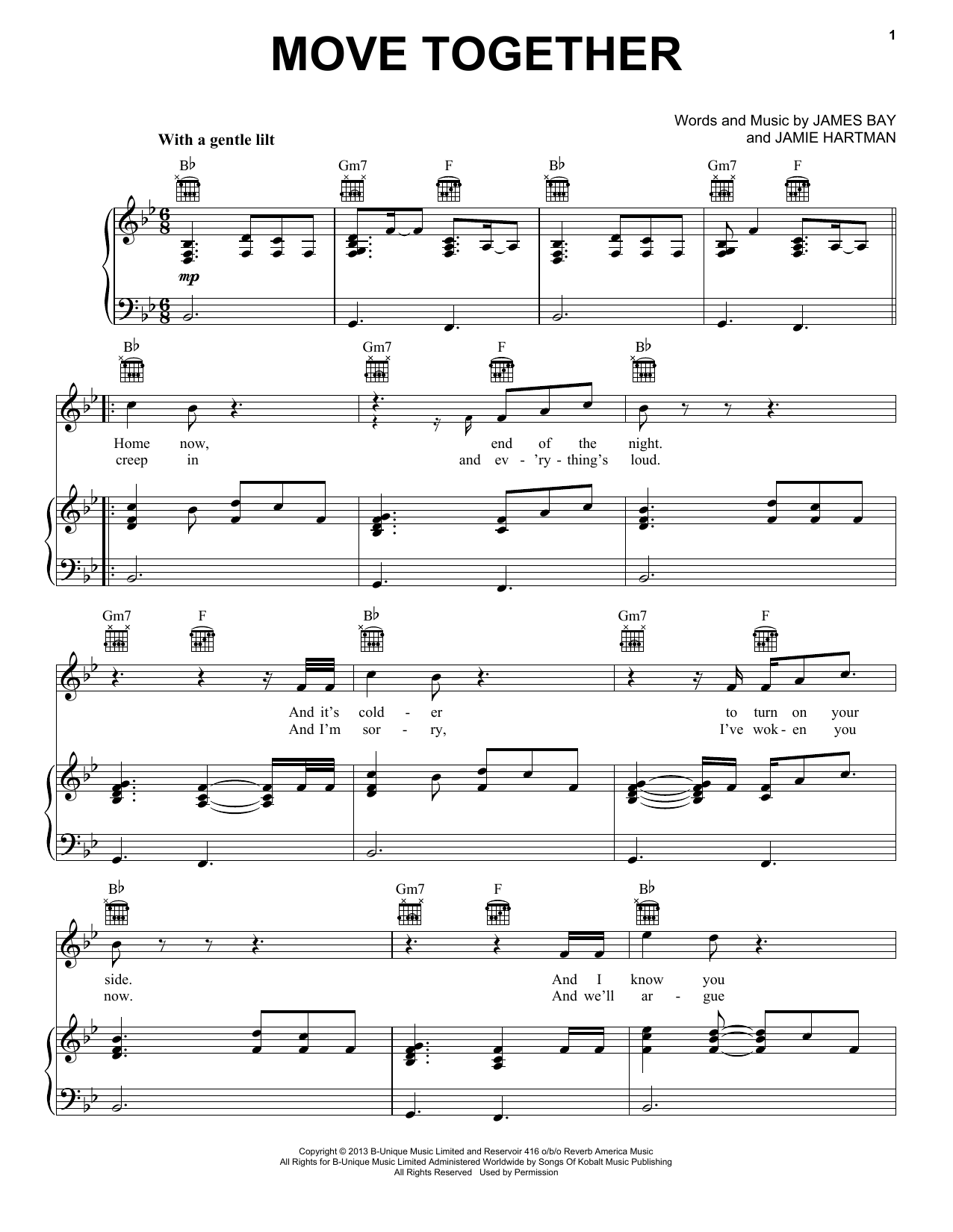 Download or print James Bay Move Together sheet music, chords and digital score arranged for Piano, Vocal & Guitar Chords (Right-Hand Melody). This Pop score includes 5 page(s).