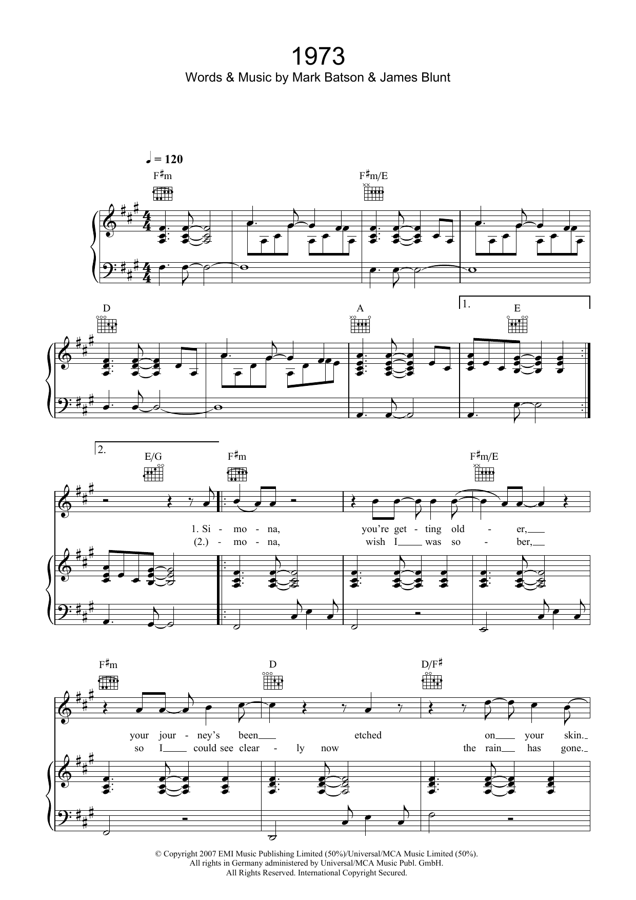 Download or print James Blunt 1973 sheet music, chords and digital score arranged for Guitar Chords/Lyrics. This Pop score includes 2 page(s).