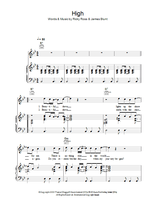 Download or print James Blunt High sheet music, chords and digital score arranged for Piano, Vocal & Guitar Chords (Right-Hand Melody). This Pop score includes 4 page(s).