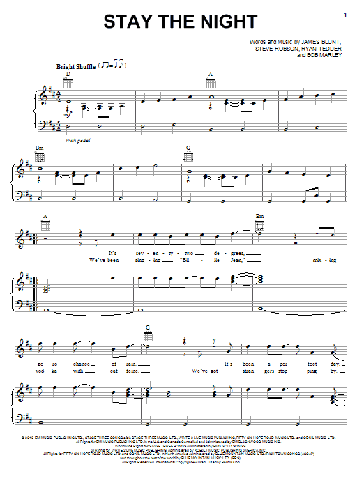 Download or print James Blunt Stay The Night sheet music, chords and digital score arranged for Piano, Vocal & Guitar Chords. This Folk score includes 6 page(s).