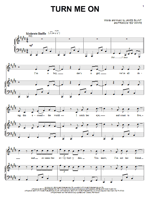 Download or print James Blunt Turn Me On sheet music, chords and digital score arranged for Piano, Vocal & Guitar Chords (Right-Hand Melody). This Pop score includes 5 page(s).