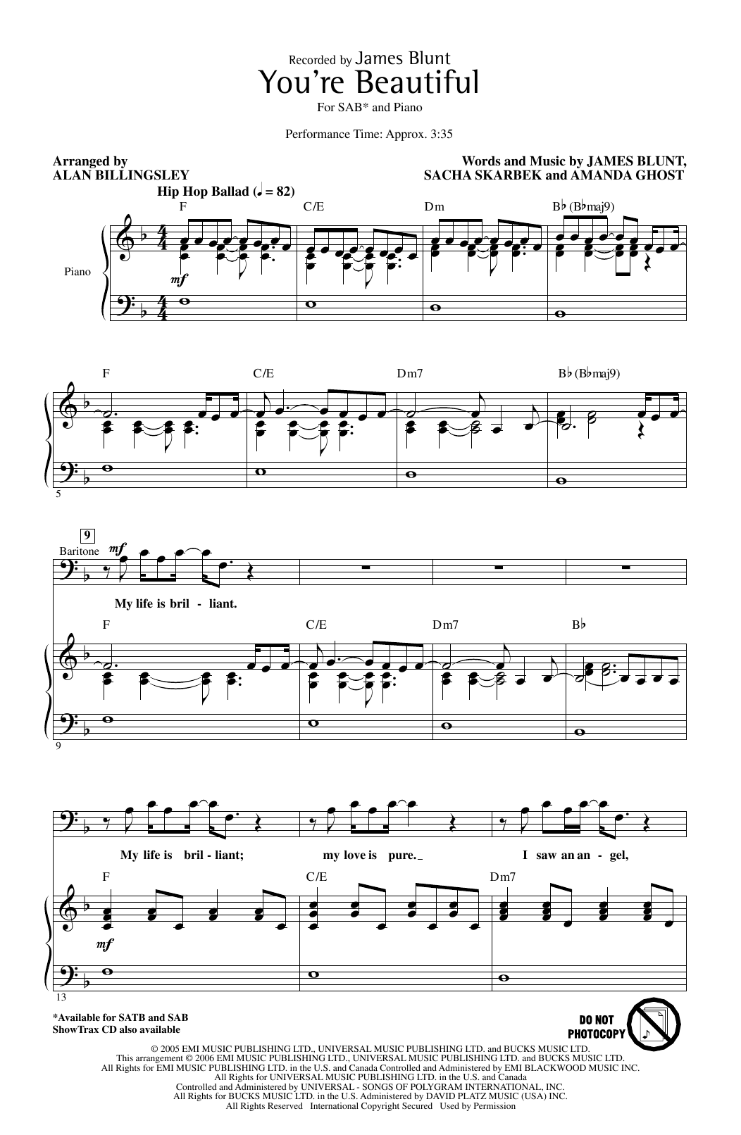 Download or print James Blunt You're Beautiful (arr. Alan Billingsley) sheet music, chords and digital score arranged for SAB Choir. This Pop score includes 7 page(s).