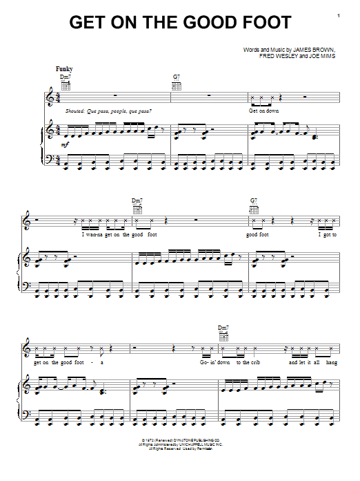Download or print James Brown Get On The Good Foot sheet music, chords and digital score arranged for Piano, Vocal & Guitar Chords (Right-Hand Melody). This Pop score includes 3 page(s).
