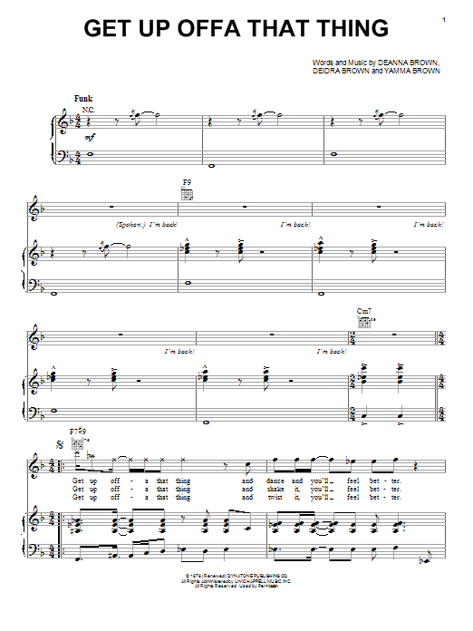 Download or print James Brown Get Up Offa That Thing sheet music, chords and digital score arranged for Piano, Vocal & Guitar Chords (Right-Hand Melody). This Pop score includes 3 page(s).