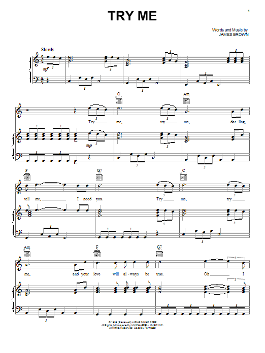 Download or print James Brown Try Me sheet music, chords and digital score arranged for Piano, Vocal & Guitar Chords (Right-Hand Melody). This Pop score includes 2 page(s).
