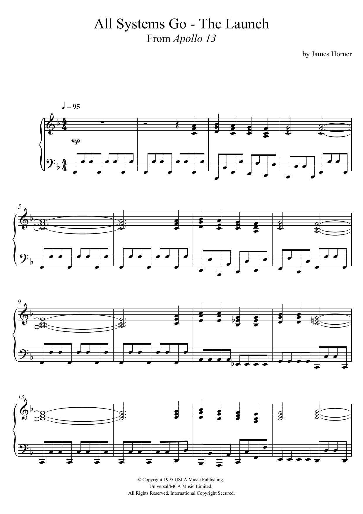 Download or print James Horner All Systems Go - The Launch (From 'Apollo 13') sheet music, chords and digital score arranged for Piano Solo. This Film/TV score includes 3 page(s).