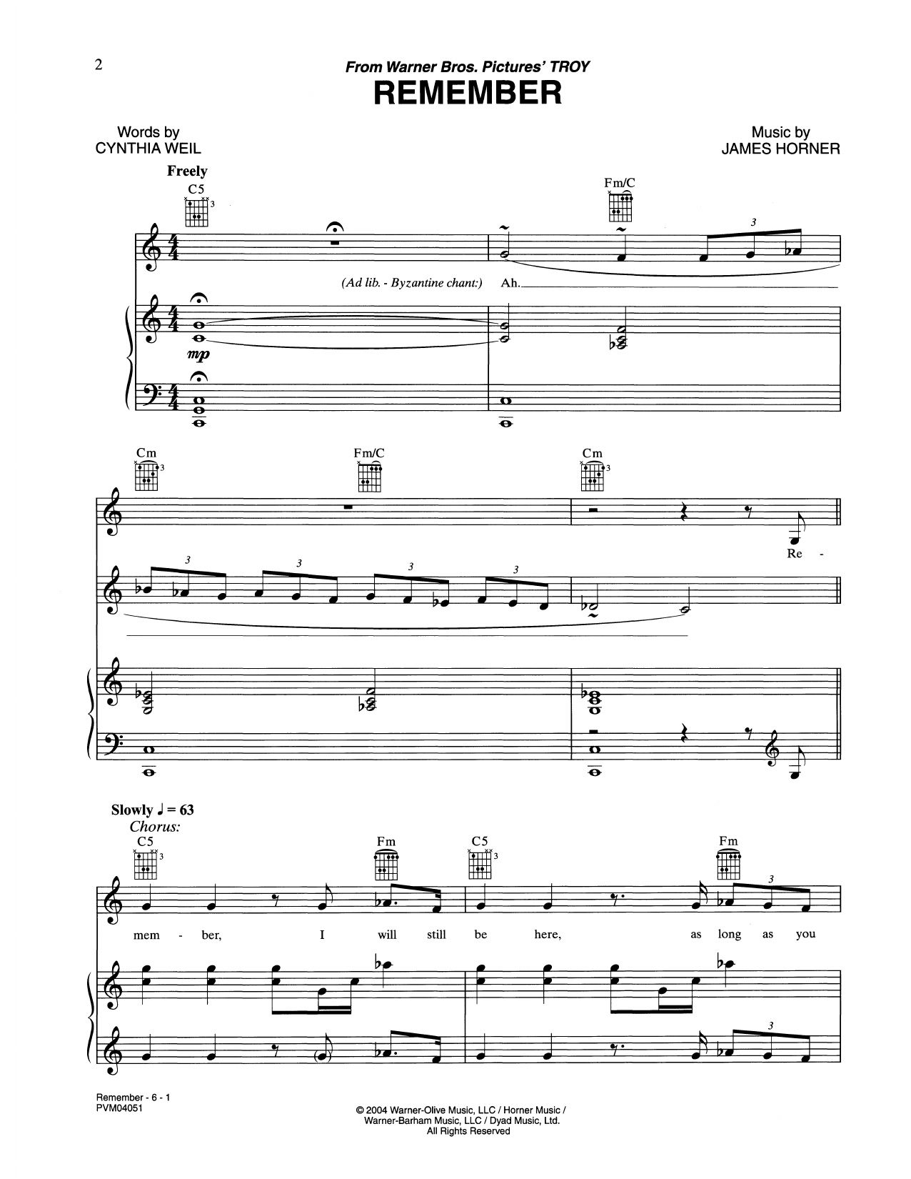 Download or print James Horner Remember (from Troy) sheet music, chords and digital score arranged for Piano, Vocal & Guitar Chords (Right-Hand Melody). This Film/TV score includes 6 page(s).