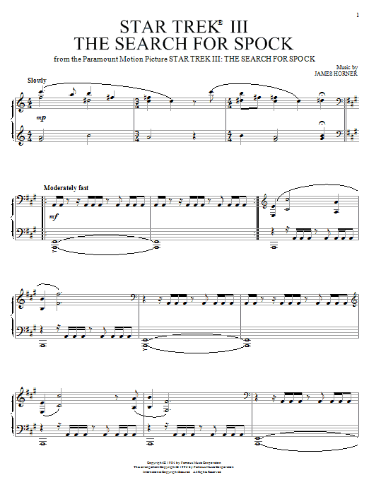 Download or print James Horner Star Trek III - The Search For Spock sheet music, chords and digital score arranged for Piano Solo. This Film/TV score includes 5 page(s).
