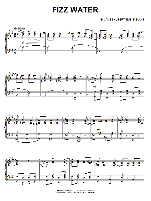 Download or print James Hubert "Eubie" Blake Fizz Water sheet music, chords and digital score arranged for Piano Solo. This Jazz score includes 7 page(s).