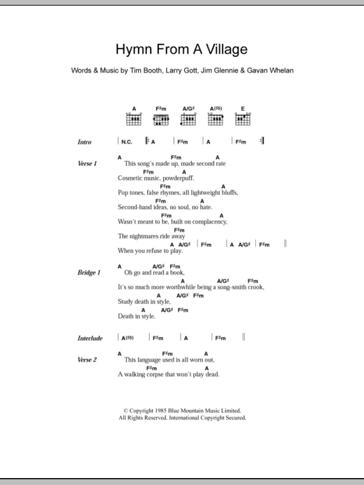 Download or print James Hymn From A Village sheet music, chords and digital score arranged for Guitar Chords/Lyrics. This Rock score includes 2 page(s).