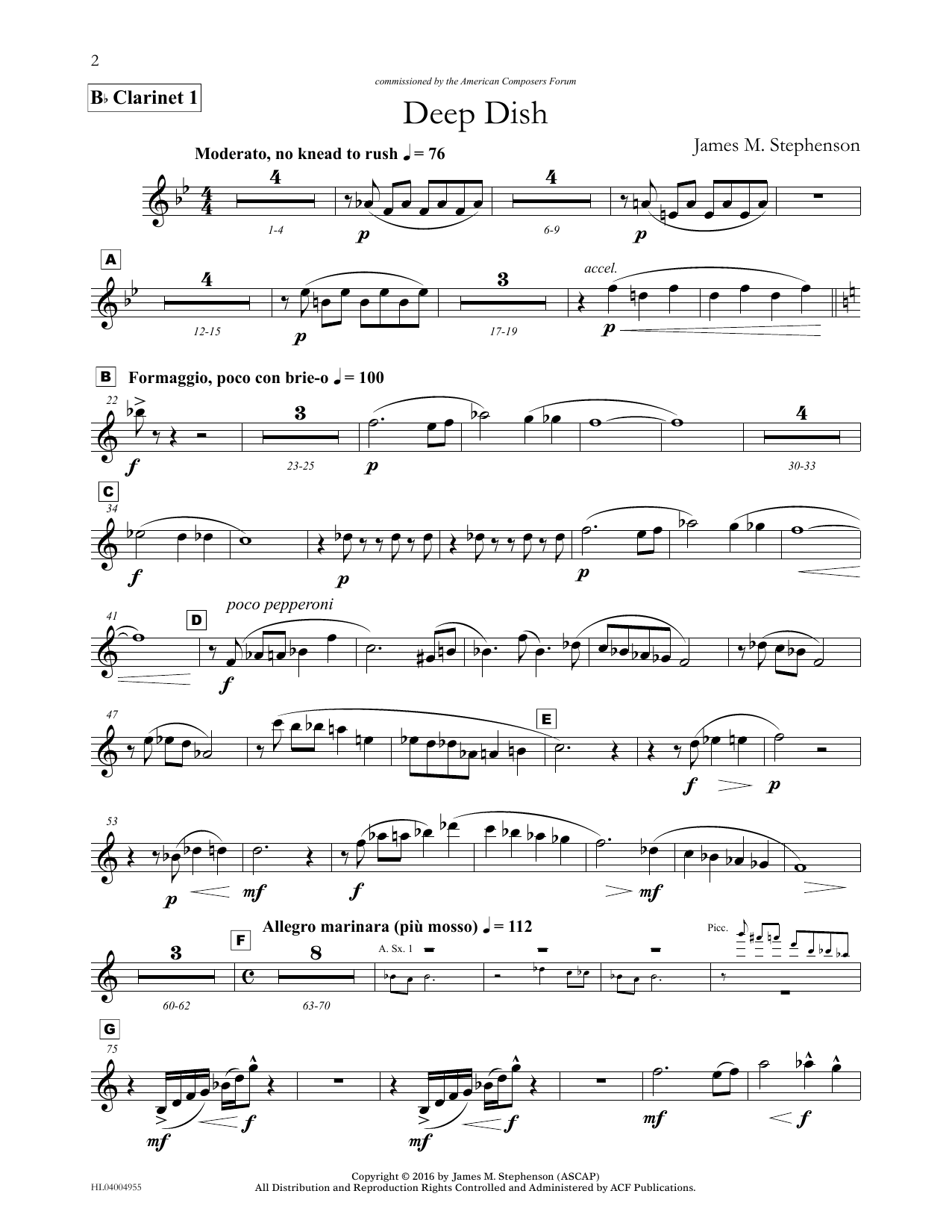Download or print James (Jim) M. Stephenson Deep Dish - Bb Clarinet 1 sheet music, chords and digital score arranged for Concert Band. This Concert score includes 2 page(s).