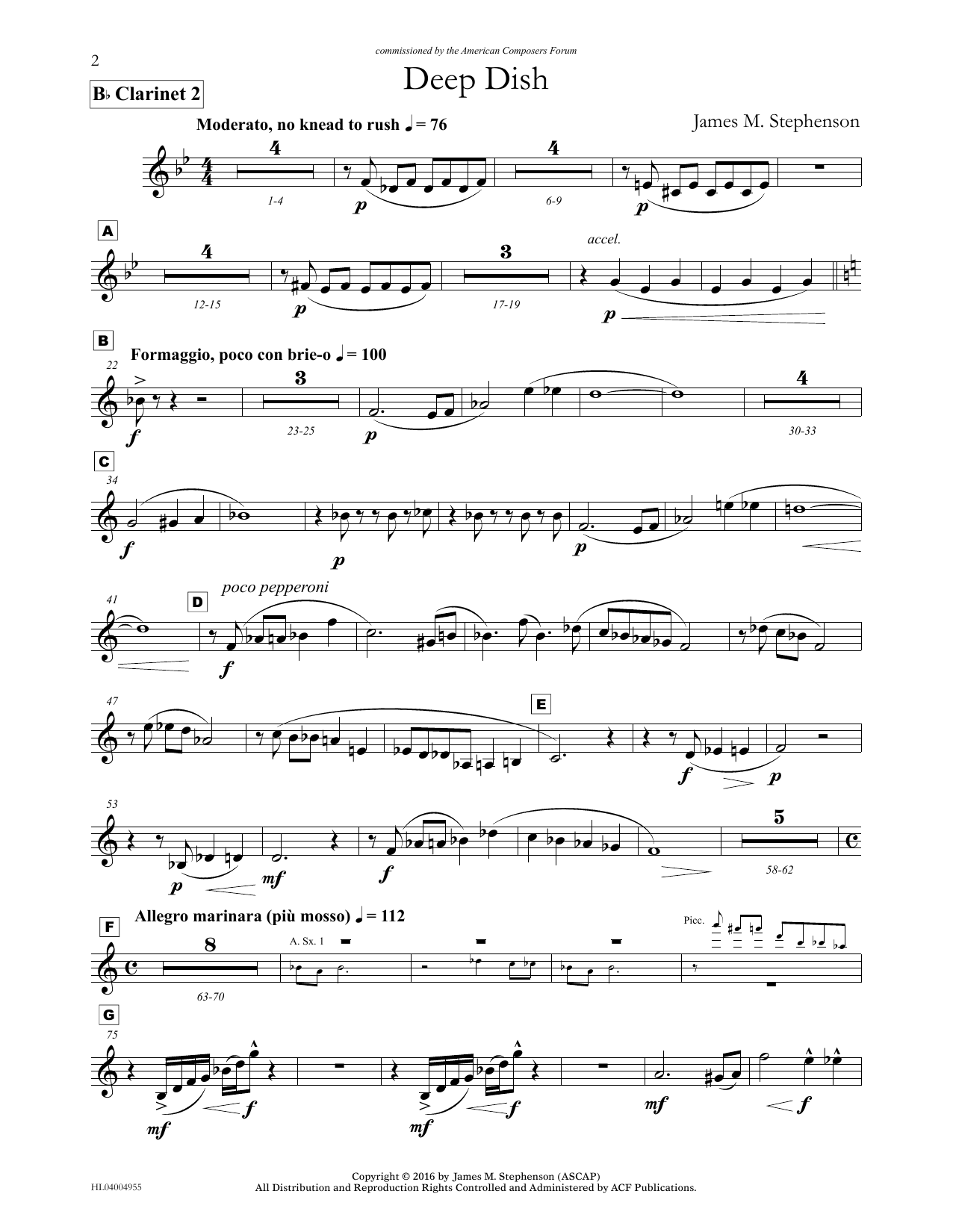 Download or print James (Jim) M. Stephenson Deep Dish - Bb Clarinet 2 sheet music, chords and digital score arranged for Concert Band. This Concert score includes 2 page(s).