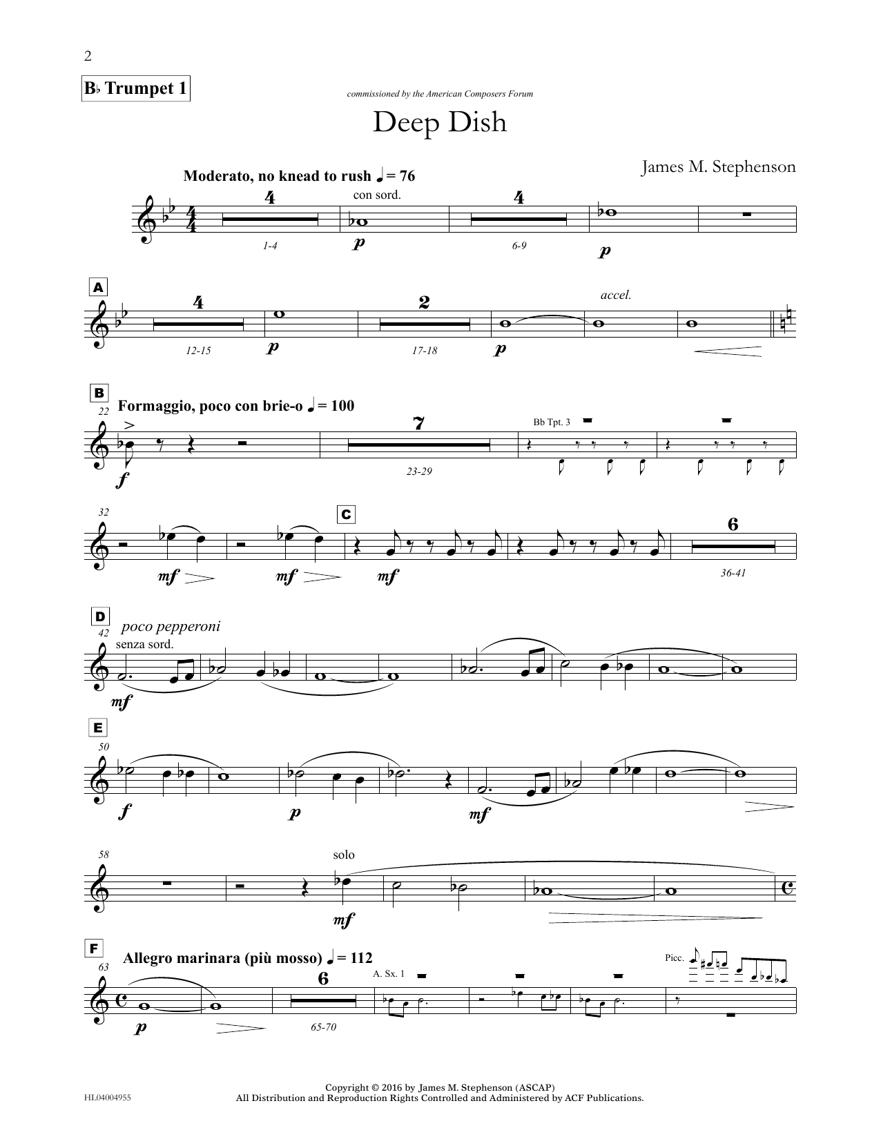 Download or print James (Jim) M. Stephenson Deep Dish - Bb Trumpet 1 sheet music, chords and digital score arranged for Concert Band. This Concert score includes 2 page(s).