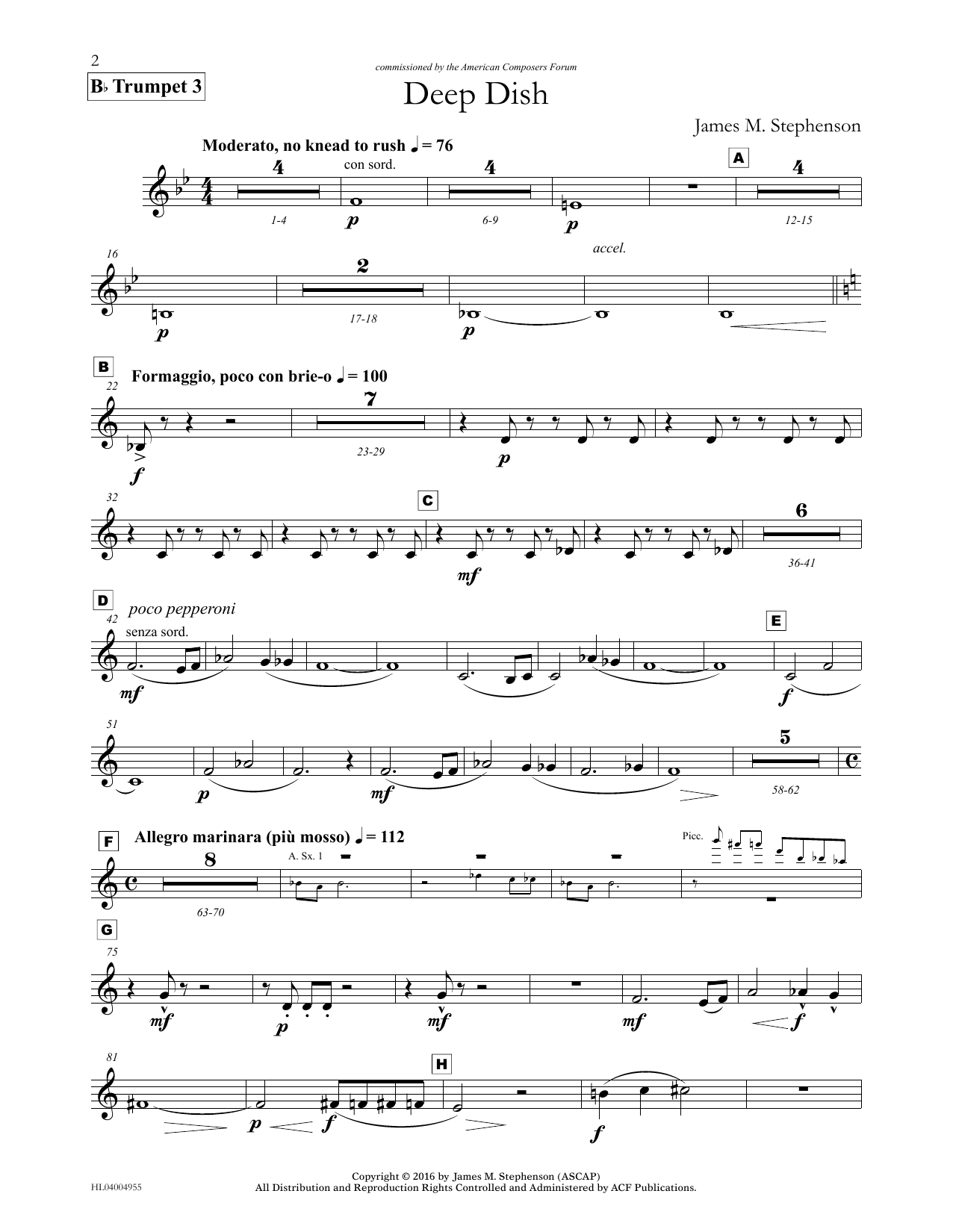 Download or print James (Jim) M. Stephenson Deep Dish - Bb Trumpet 3 sheet music, chords and digital score arranged for Concert Band. This Concert score includes 2 page(s).