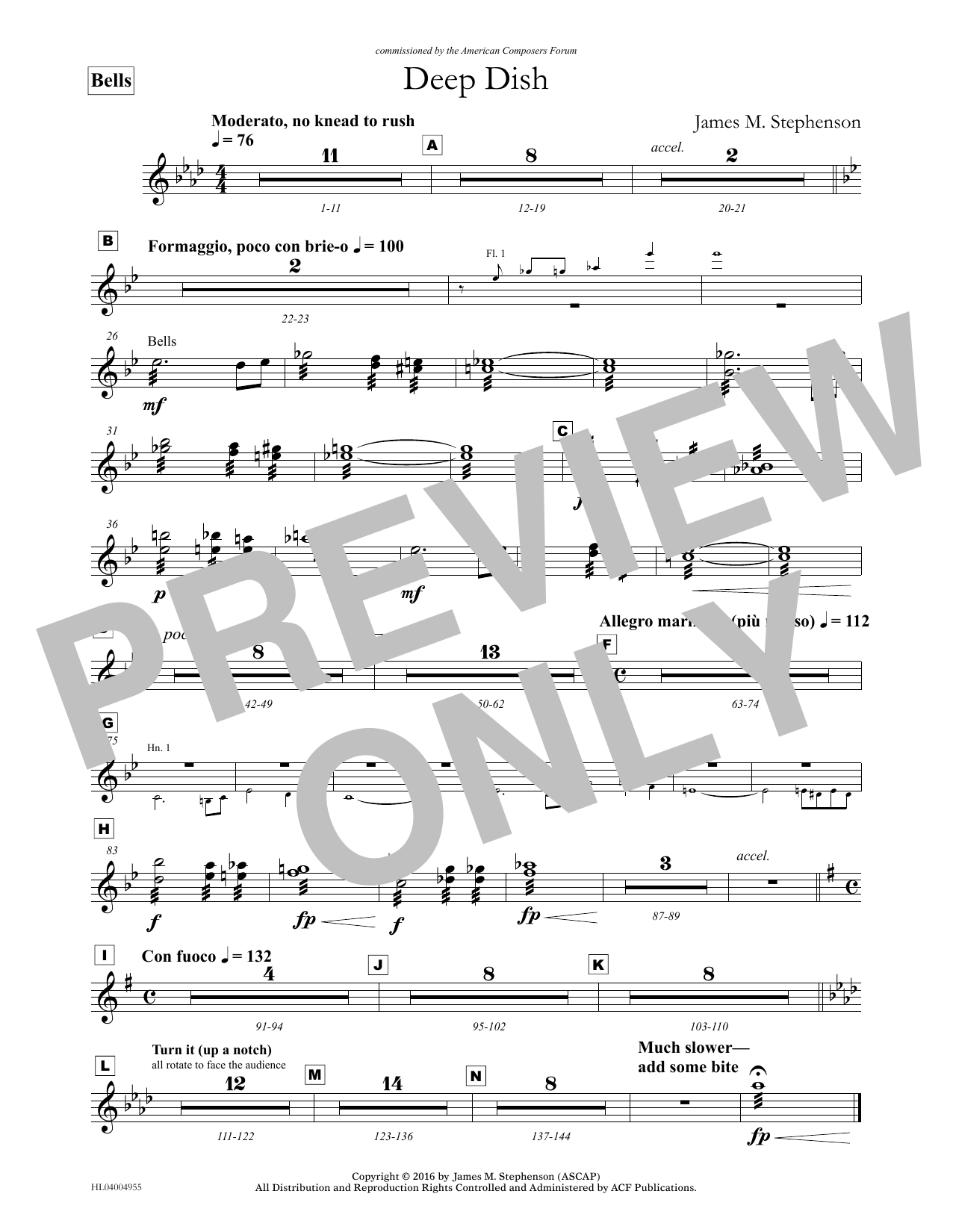 Download or print James (Jim) M. Stephenson Deep Dish - Bells sheet music, chords and digital score arranged for Concert Band. This Concert score includes 1 page(s).