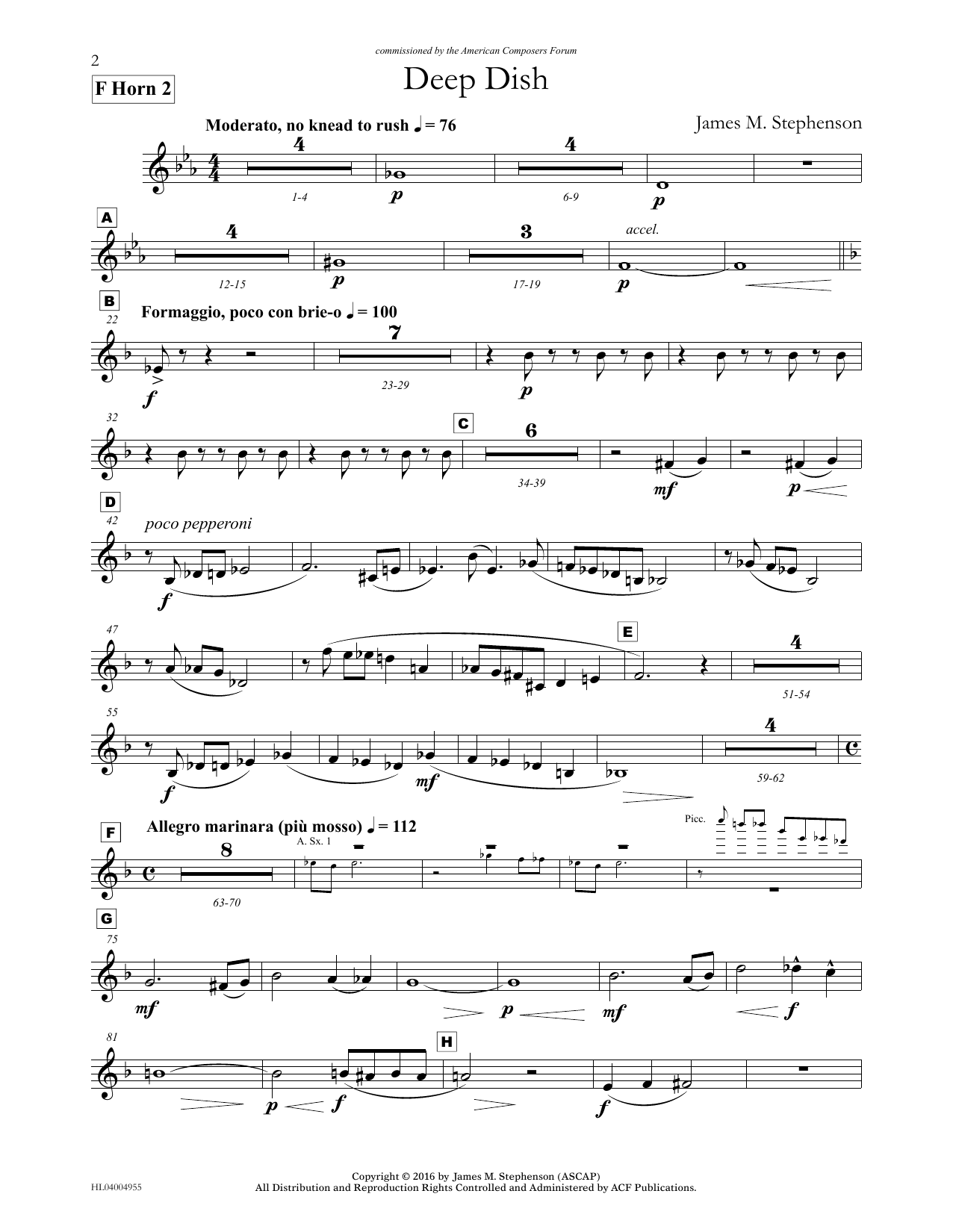 Download or print James (Jim) M. Stephenson Deep Dish - F Horn 2 sheet music, chords and digital score arranged for Concert Band. This Concert score includes 2 page(s).