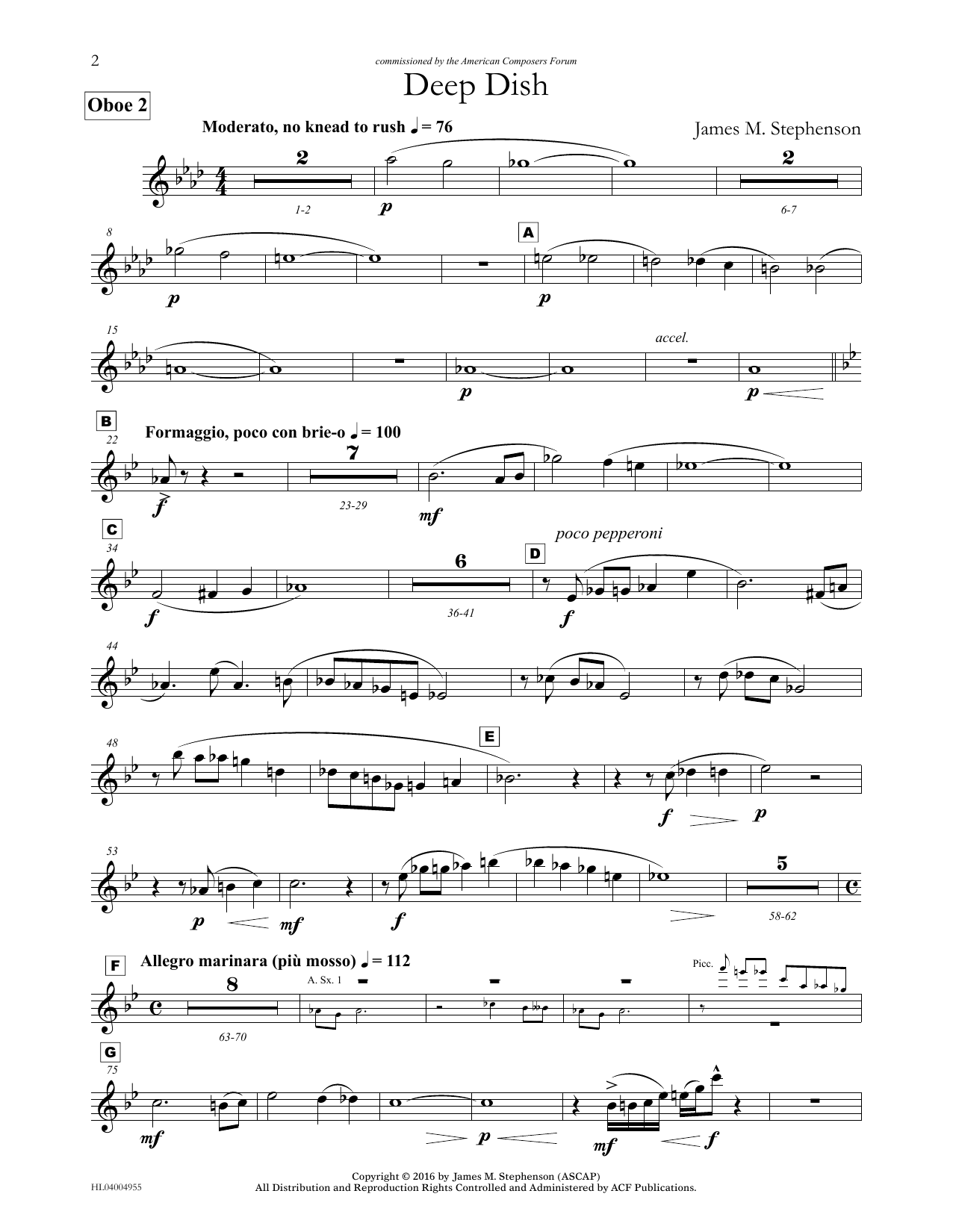 Download or print James (Jim) M. Stephenson Deep Dish - Oboe 2 sheet music, chords and digital score arranged for Concert Band. This Concert score includes 2 page(s).