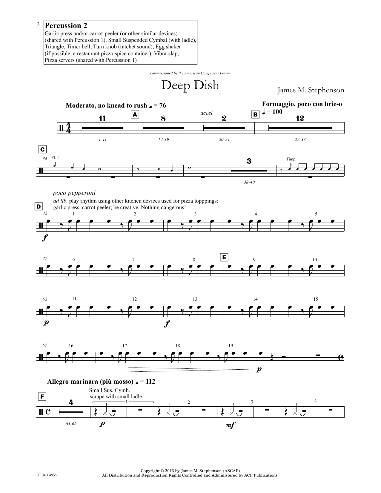 Download or print James (Jim) M. Stephenson Deep Dish - Percussion II sheet music, chords and digital score arranged for Concert Band. This Concert score includes 2 page(s).