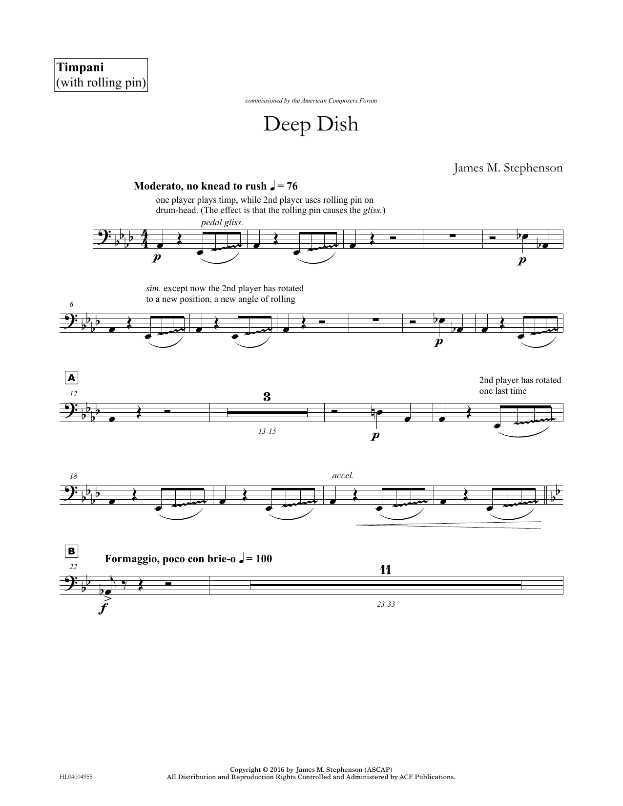 Download or print James (Jim) M. Stephenson Deep Dish - Timpani sheet music, chords and digital score arranged for Concert Band. This Concert score includes 3 page(s).