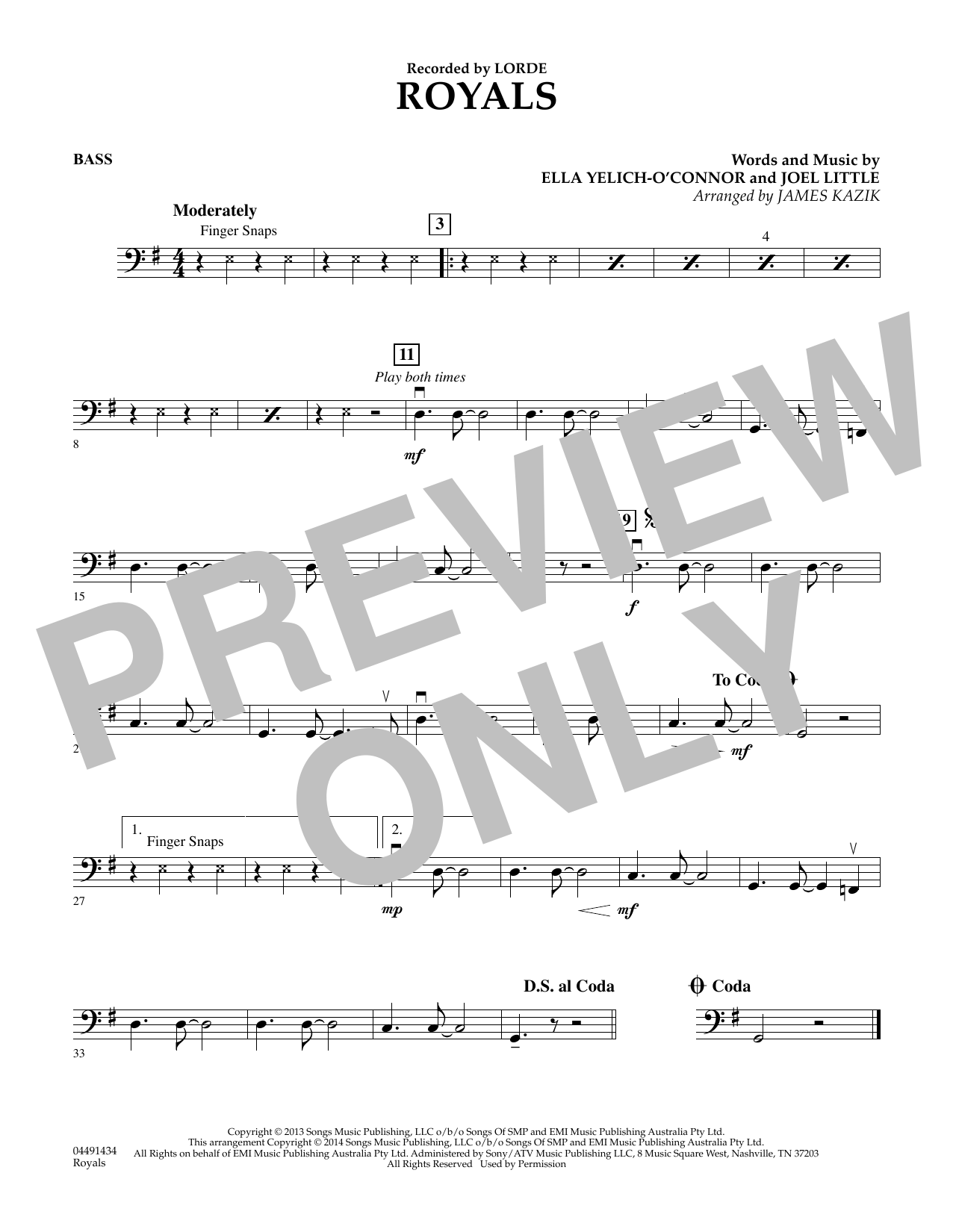 Download or print James Kazik Royals - Bass sheet music, chords and digital score arranged for Orchestra. This Pop score includes 1 page(s).