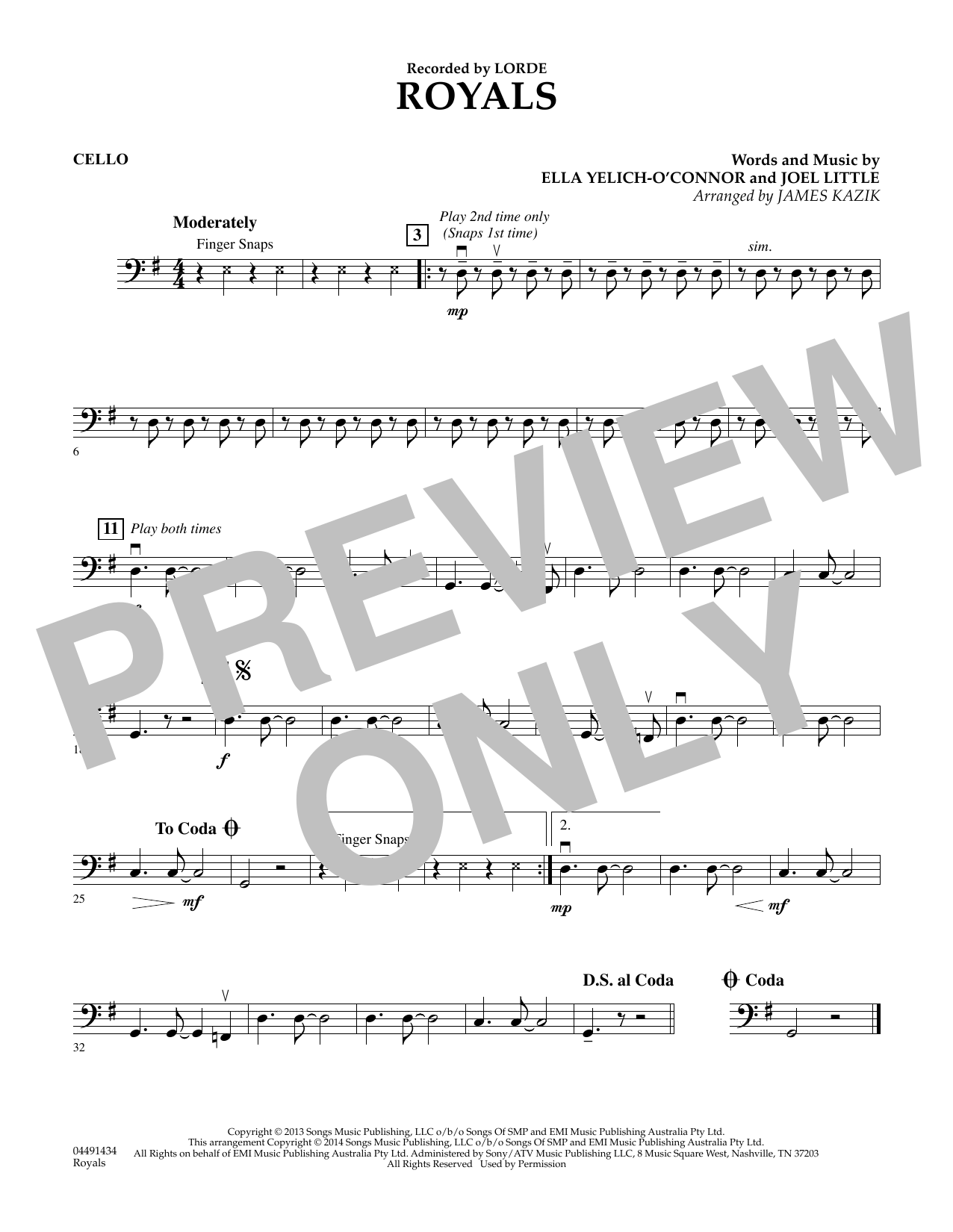 Download or print James Kazik Royals - Cello sheet music, chords and digital score arranged for Orchestra. This Pop score includes 1 page(s).