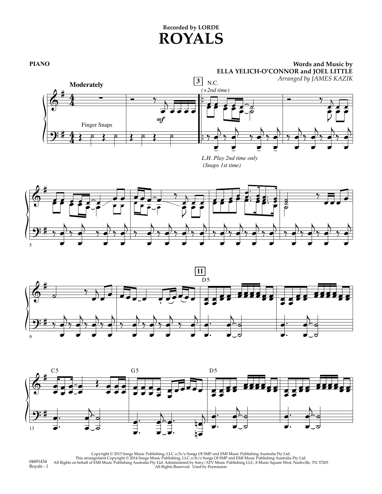 Download or print James Kazik Royals - Piano sheet music, chords and digital score arranged for Orchestra. This Pop score includes 2 page(s).
