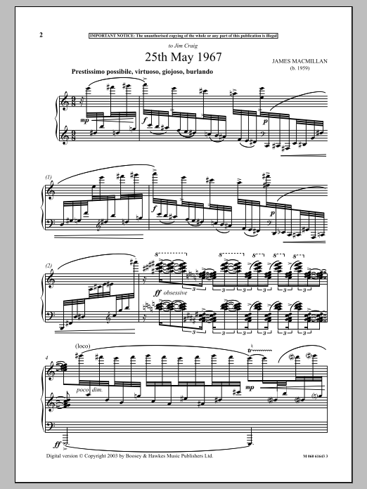 Download or print James MacMillan 25th May 1967 sheet music, chords and digital score arranged for Piano Solo. This Classical score includes 4 page(s).