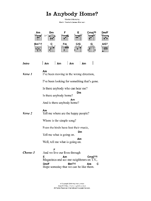 Download or print James Morrison Is Anybody Home? sheet music, chords and digital score arranged for Guitar Chords/Lyrics. This Pop score includes 3 page(s).