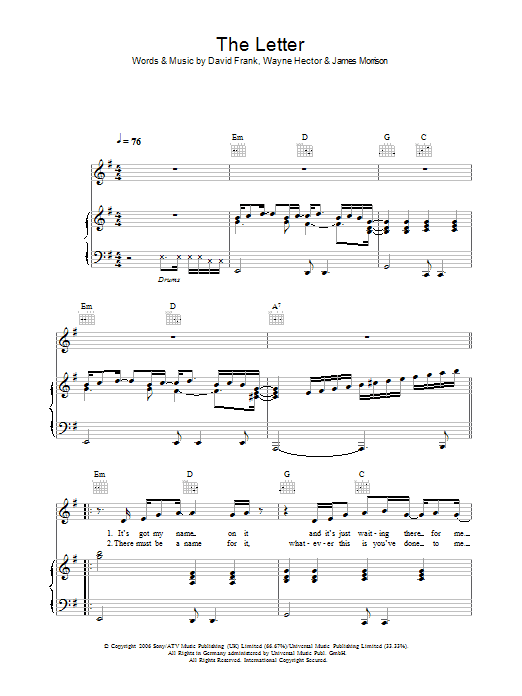 Download or print James Morrison The Letter sheet music, chords and digital score arranged for Guitar Chords/Lyrics. This Pop score includes 3 page(s).