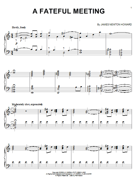 Download or print James Newton Howard A Fateful Meeting sheet music, chords and digital score arranged for Piano Solo. This Film/TV score includes 5 page(s).
