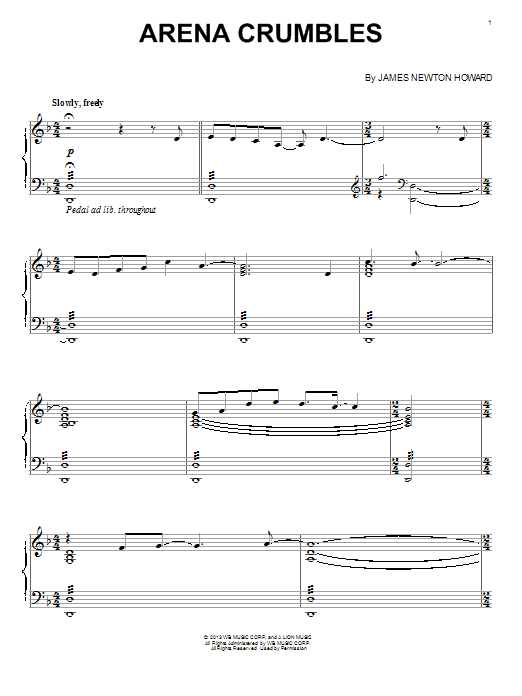 Download or print James Newton Howard Arena Crumbles sheet music, chords and digital score arranged for Piano Solo. This Film/TV score includes 2 page(s).