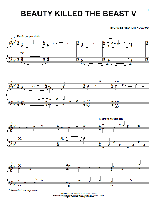 Download or print James Newton Howard Beauty Killed The Beast V sheet music, chords and digital score arranged for Piano Solo. This Film/TV score includes 4 page(s).
