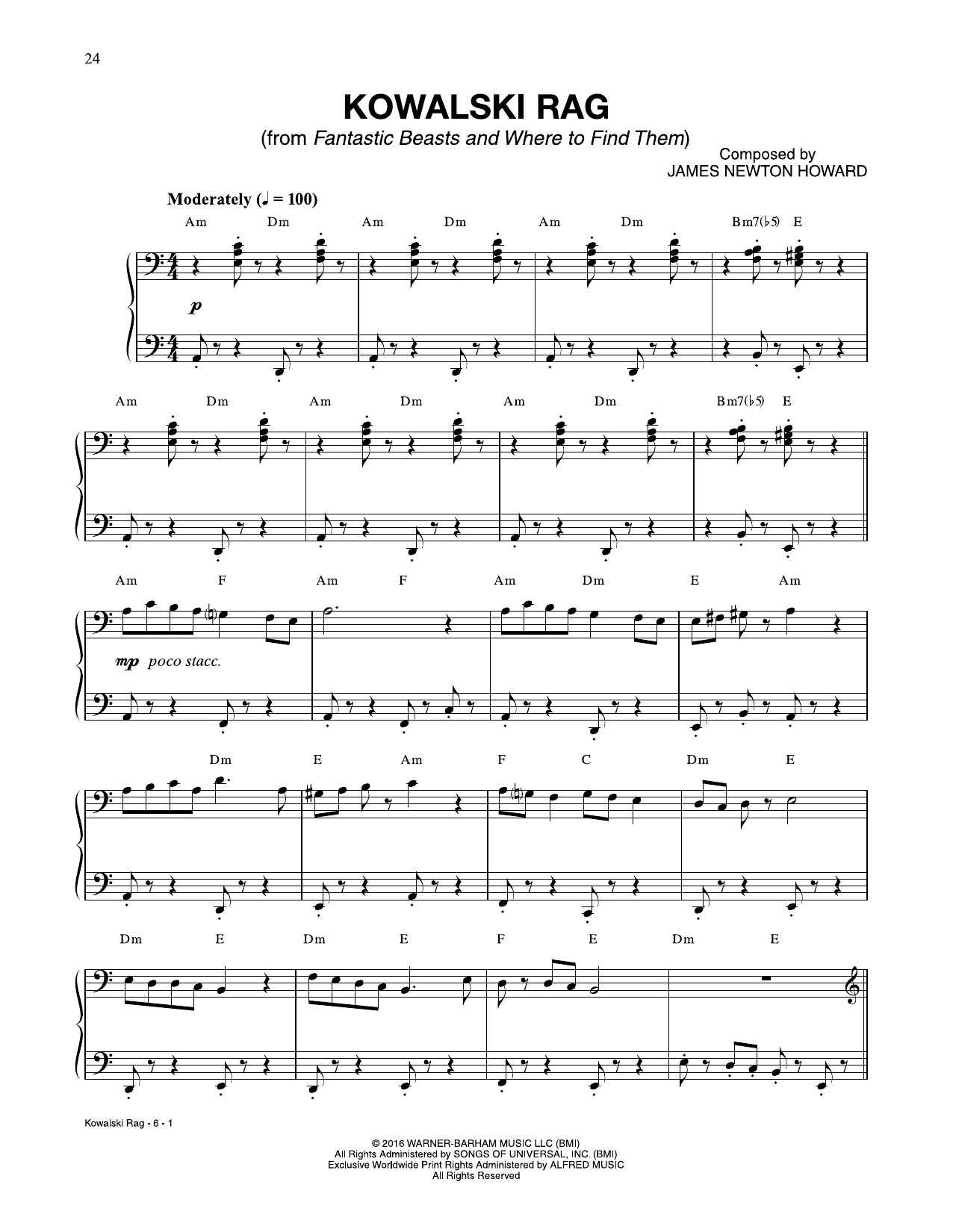 Download or print James Newton Howard Kowalski Rag (from Fantastic Beasts And Where To Find Them) sheet music, chords and digital score arranged for Piano Solo. This Film/TV score includes 6 page(s).