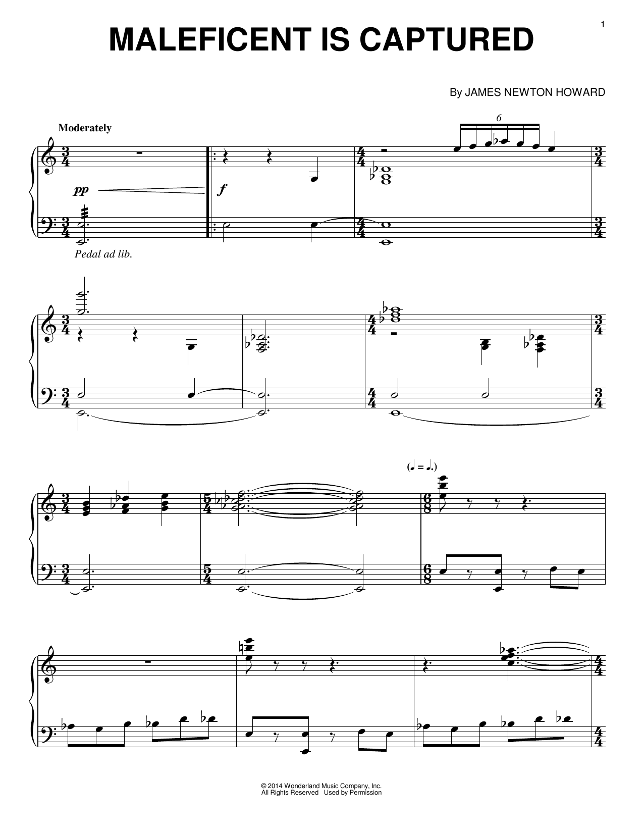 Download or print James Newton Howard Maleficent Is Captured sheet music, chords and digital score arranged for Piano Solo. This Pop score includes 5 page(s).