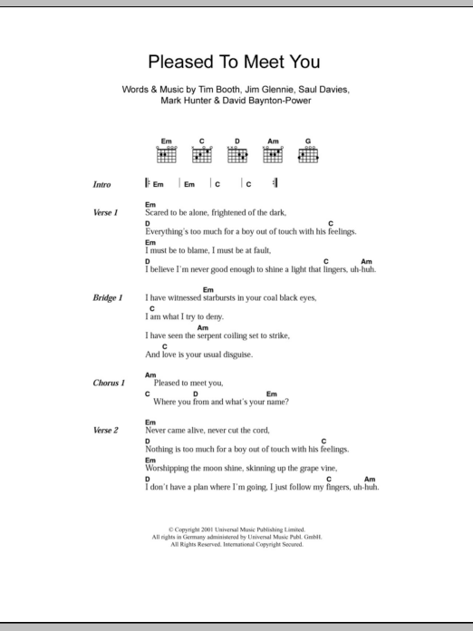 Download or print James Pleased To Meet You sheet music, chords and digital score arranged for Guitar Chords/Lyrics. This Rock score includes 2 page(s).