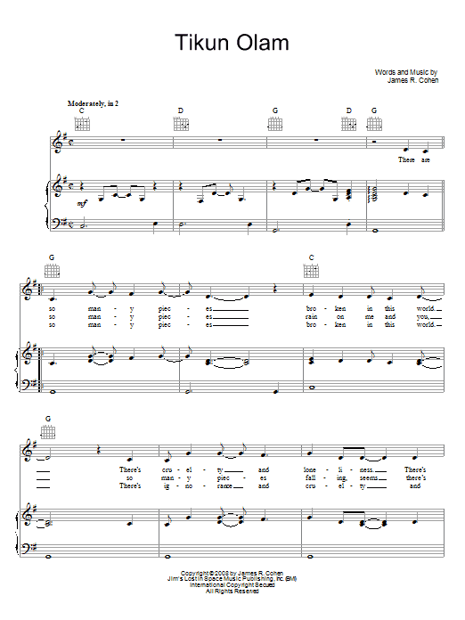 Download or print James R. Cohen Tikun Olam sheet music, chords and digital score arranged for Piano, Vocal & Guitar Chords (Right-Hand Melody). This Children score includes 4 page(s).