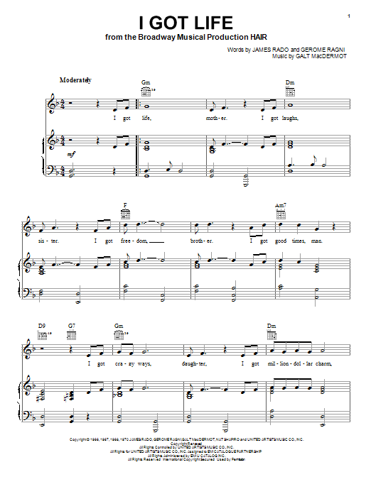 Download or print James Rado I Got Life sheet music, chords and digital score arranged for Piano, Vocal & Guitar Chords (Right-Hand Melody). This Pop score includes 3 page(s).