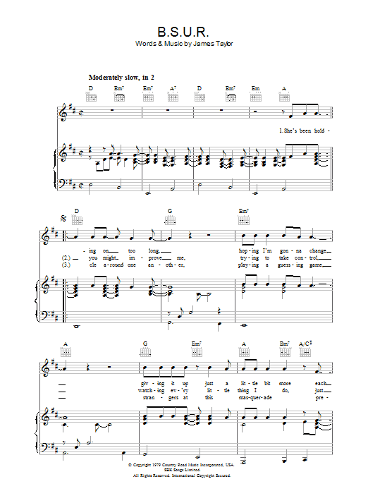 Download or print James Taylor B.S.U.R. sheet music, chords and digital score arranged for Piano, Vocal & Guitar Chords. This Rock score includes 5 page(s).