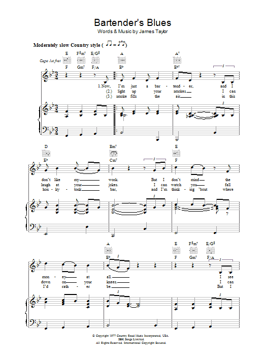 Download or print James Taylor Bartender's Blues sheet music, chords and digital score arranged for Piano, Vocal & Guitar Chords. This Rock score includes 4 page(s).