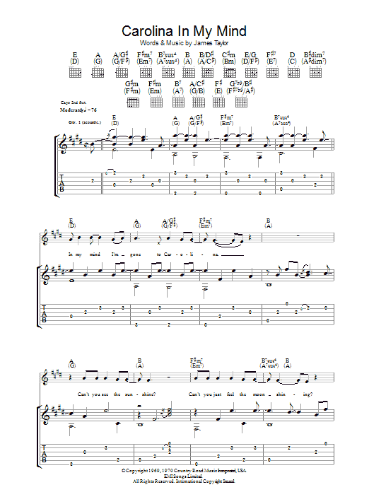 Download or print James Taylor Carolina In My Mind sheet music, chords and digital score arranged for Piano, Vocal & Guitar Chords (Right-Hand Melody). This Folk score includes 4 page(s).