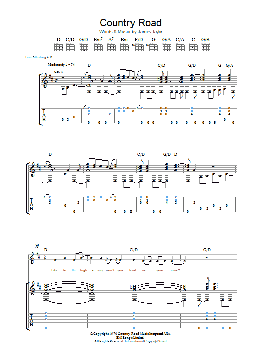 Download or print James Taylor Country Road sheet music, chords and digital score arranged for Guitar Tab. This Rock score includes 9 page(s).