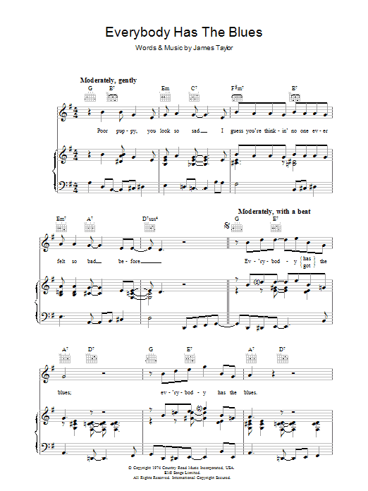 Download or print James Taylor Everybody Has The Blues sheet music, chords and digital score arranged for Piano, Vocal & Guitar Chords. This Rock score includes 5 page(s).
