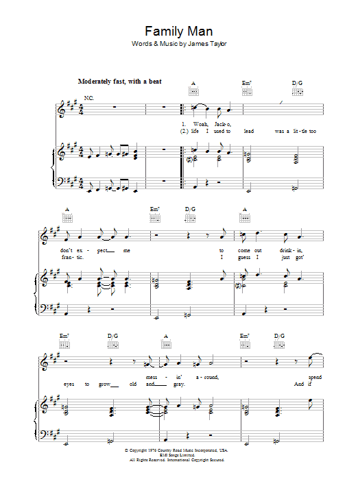 Download or print James Taylor Family Man sheet music, chords and digital score arranged for Piano, Vocal & Guitar Chords. This Rock score includes 6 page(s).